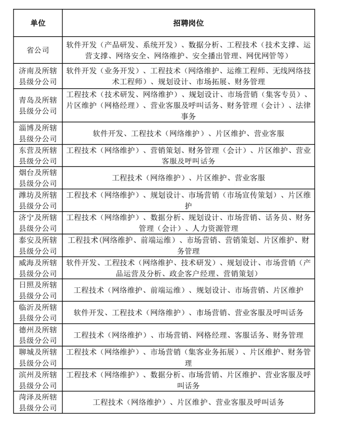 本次招聘涉及省、市、县公司软件开发、工程技术(含技术研发、前端运维、网络维护、技术支撑等)、规划设计、数据分析、市场营销(含集客业务等)、营销策划、片区维护(网格经理、客户经理等)、营业客服、呼叫话务、法律事务、财务管理、人力资源等12大类316个岗位。详见附件《招聘岗位及有关要求》。