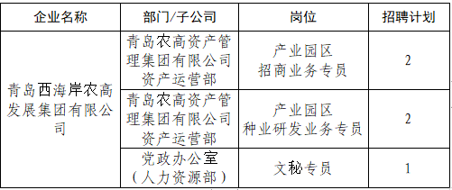 为满足集团业务发展需要,青岛西海岸农高发展集团有限公司现面向社会公开招聘工作人员5名,具体招聘公告如下: