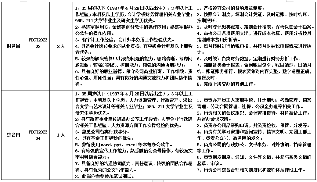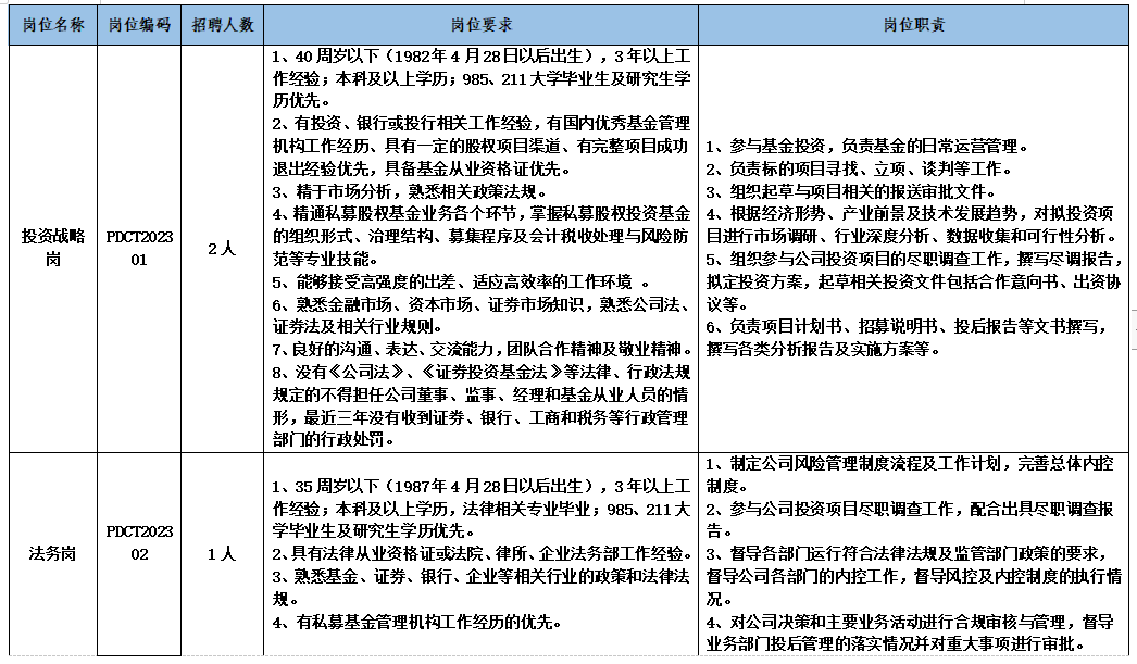 此次面向社会拟公开招聘工作人员6名,其中投资战略岗2名、法务岗1名、财务岗2名、综合岗1名。招聘岗位及具体要求如下: